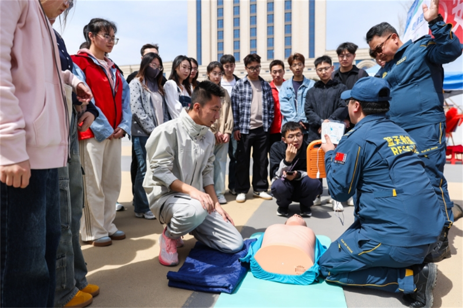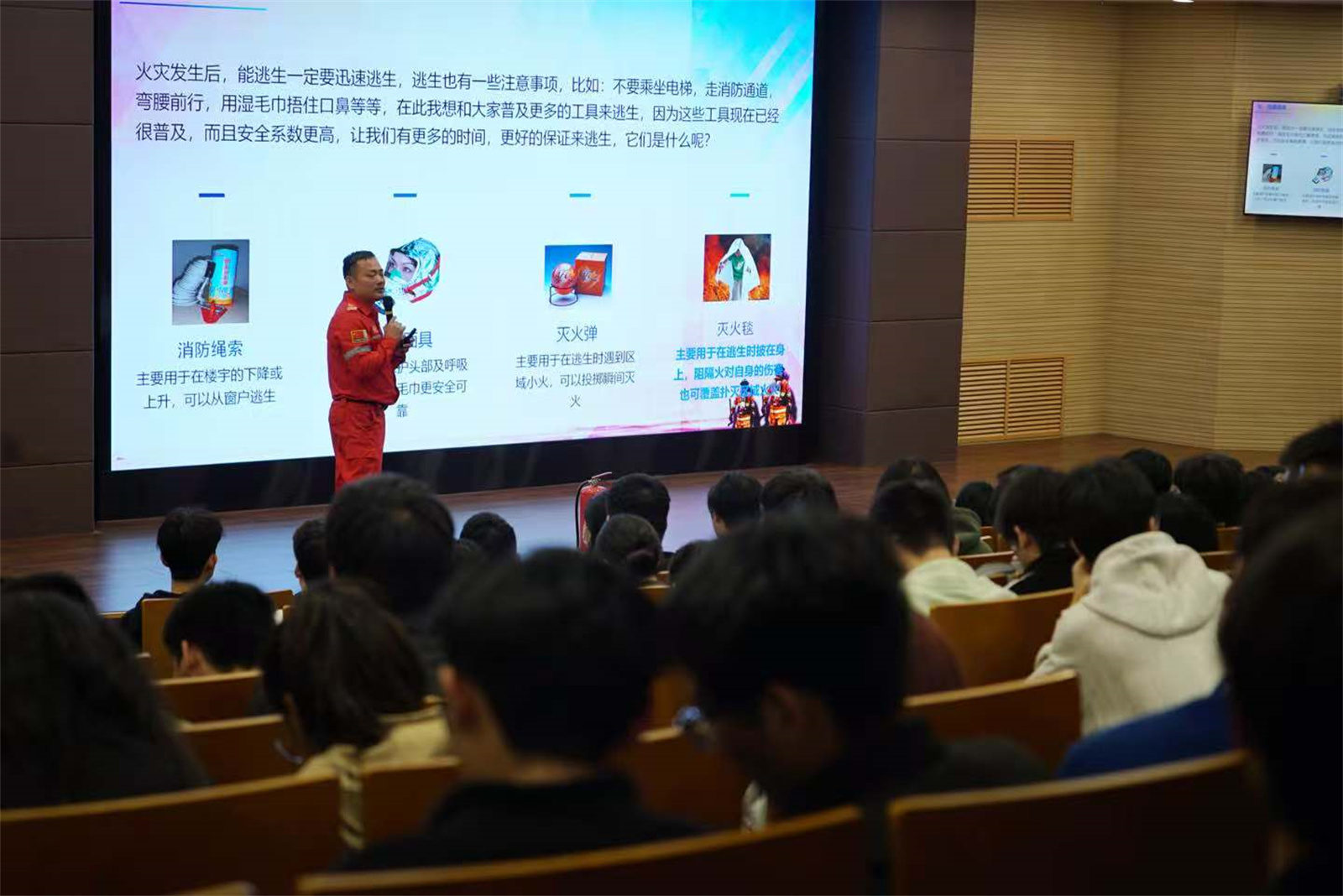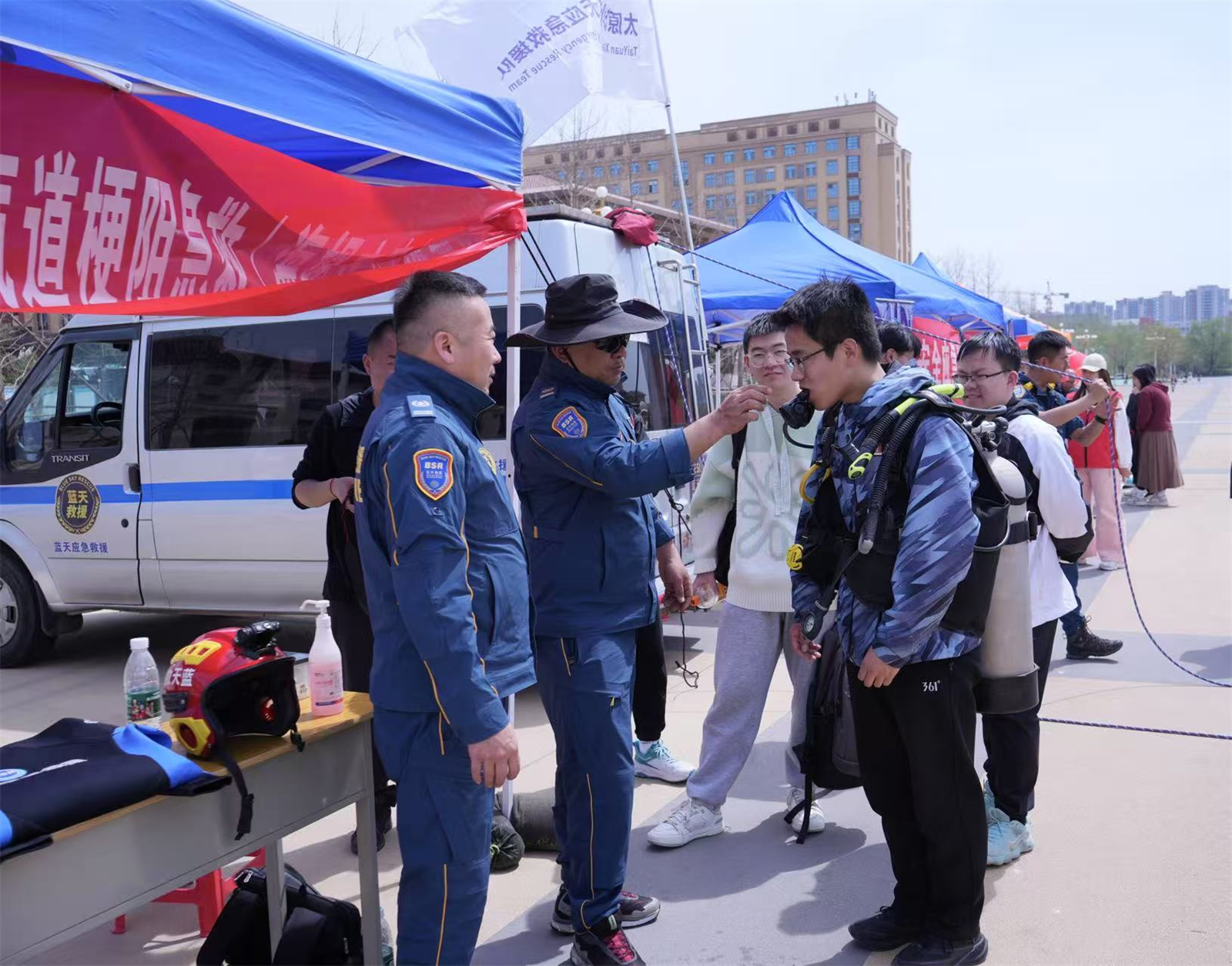 活动聚焦“安全文化与应急科普”,通过学生自主学习、观看讲座、参加科普活动宣传、场景实训、现场体验和志愿服务等形式,提升学生对于安全文化的认知水平,增强其应急处置能力以及相关科普知识的储备,营造良好的校园安全文化氛围,让每一位学生都能将安全意识融入日常习惯,让应急技能成为必备素养。活动现场布置了20余种安全与应急实践体验展区,包括心肺复苏体验区、止血包扎体验区、绳索技术体验区、灭火防护服体验区、模拟烟雾逃生体验馆、模拟灭火体验馆、消防火灾演练帐篷等,覆盖了“防、减、救”全链条。其中,在太原市小店区蓝天应急救援队心肺复苏与AED使用体验区,专业人员向学生讲解成人心肺复苏按压与通气比例为30:2,并指导在场学生掌握除颤仪操作步骤,强调“黄金四分钟”急救的关键作用;绳索技术区聚焦户外救援场景,学生学习布林结、“8”字结等实用绳结打法,并体验简易担架制作,锤炼应急“真本领”;在校企合作展区,山西虹安科技股份有限公司展示了智能灭火机器人、阻燃防护服等前沿科技装备,并通过“训战结合”模式开展“沉浸式”应急处置实训课;在北京螭吻基地展区,学生“沉浸式”感受了VR灭火、VR逃生、烟雾逃生等安全与应急设备,在情景模拟中提高了安全防护能力;在明向校区图书馆,北京应急总队培训师牛犇老师围绕“让大安全—大应急理念内化于心+外践于行”主题,结合校园内外发生的真实案例,深入浅出地剖析各类安全事故发生的原因,并提出科学、可行的安全防护与应急措施,培养大学生正确的安全观和应急创新思维。